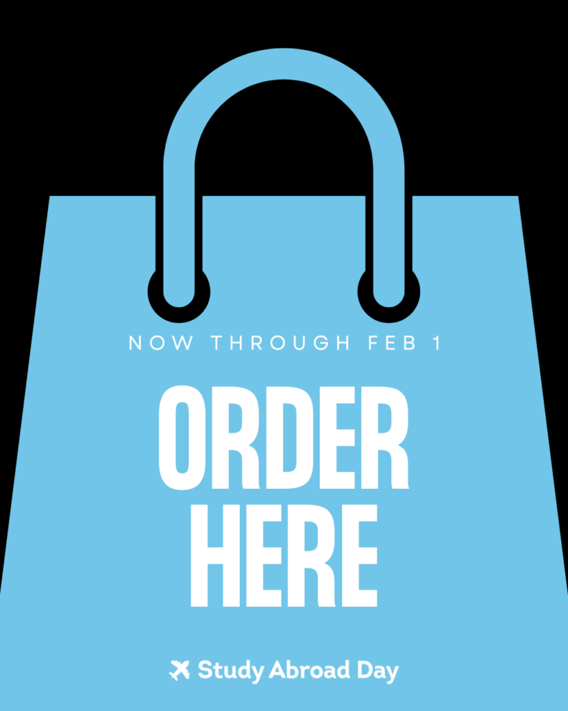 Order by Sunday, February 1 (12:00am EST) to ensure delivery by Study Abroad Day!